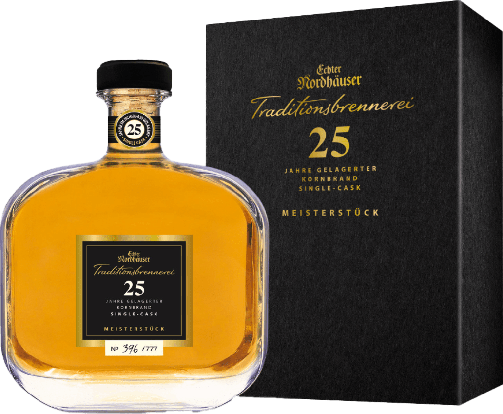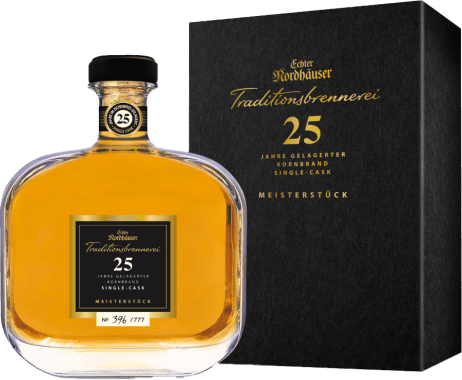 "Unser Meisterstück ist 25 Jahre in einem ausgewählten Eichenfass gereift. Golden in der Farbe, herrlich rund und harmonisch im Geschmack. Ein Premium-Kornbrand für die ganz besonderen Momente im Leben. In edler Geschenkpackung mit Magnetverschluss. Streng limitiert auf 777 Flaschen. Jede Flasche wird per Hand nummeriert!"