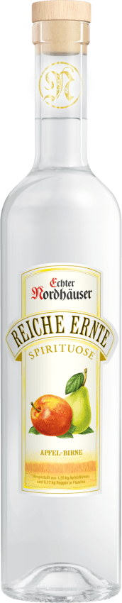 Echter Nordhäuser Reiche Ernte Apfel-Birne ist die erlesene Komposition aus mildem Kornbrand und ausgesuchtem Obstwasser, die den charaktervollen und milden Geschmack kennzeichnen.