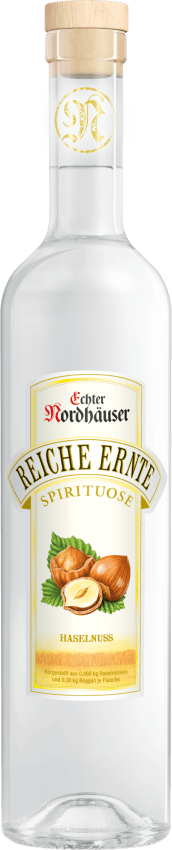 Reiche Ernte Haselnuss, die raffinierte Komposition aus hochwertigem Haselnussdestillat und Echter Nordhäuser Kornbrand begeistert Genießer durch ihren vollmundig, nussigen Geschmack und ihre Milde.